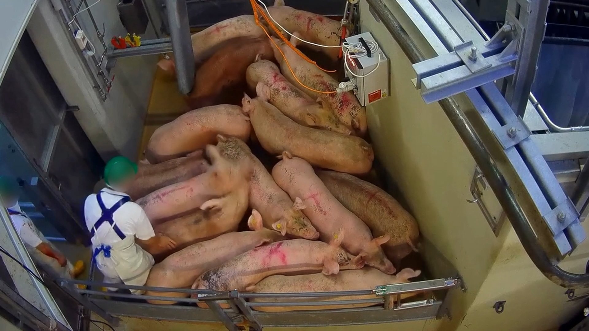 Les cochons sont entassés avant d’être électrocutés et égorgés.
