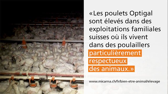 Migros vante les produits de sa marque Optigal en disant qu’ils sont « particulièrement respectueux des animaux », or on voit bien que cela ne correspond en rien à la réalité de ces poulets, qui vivent une vie de misère et finissent tous à l’abattoir.