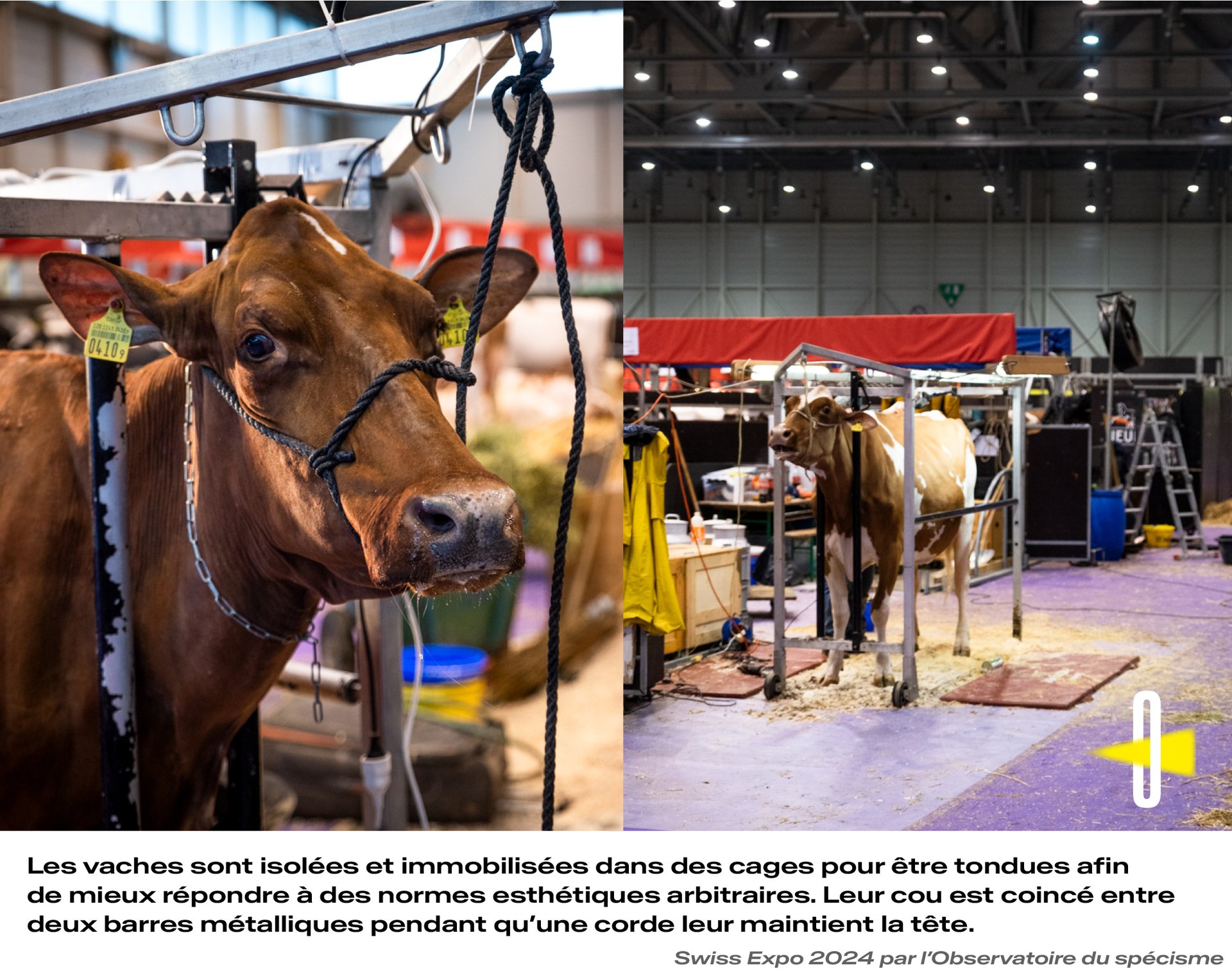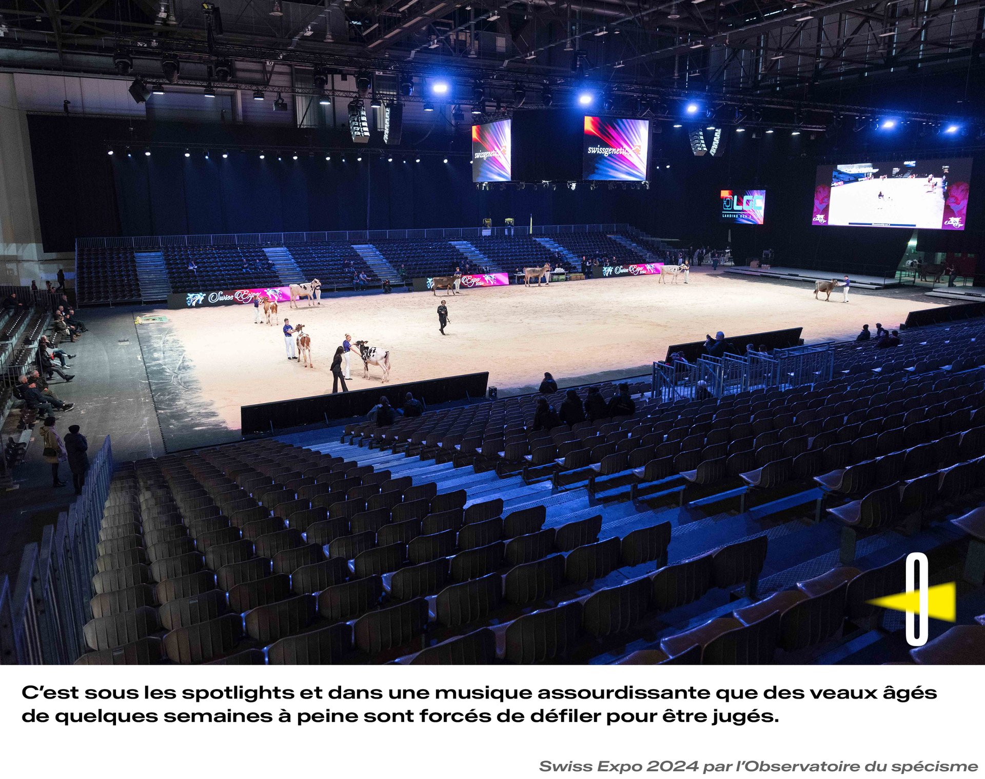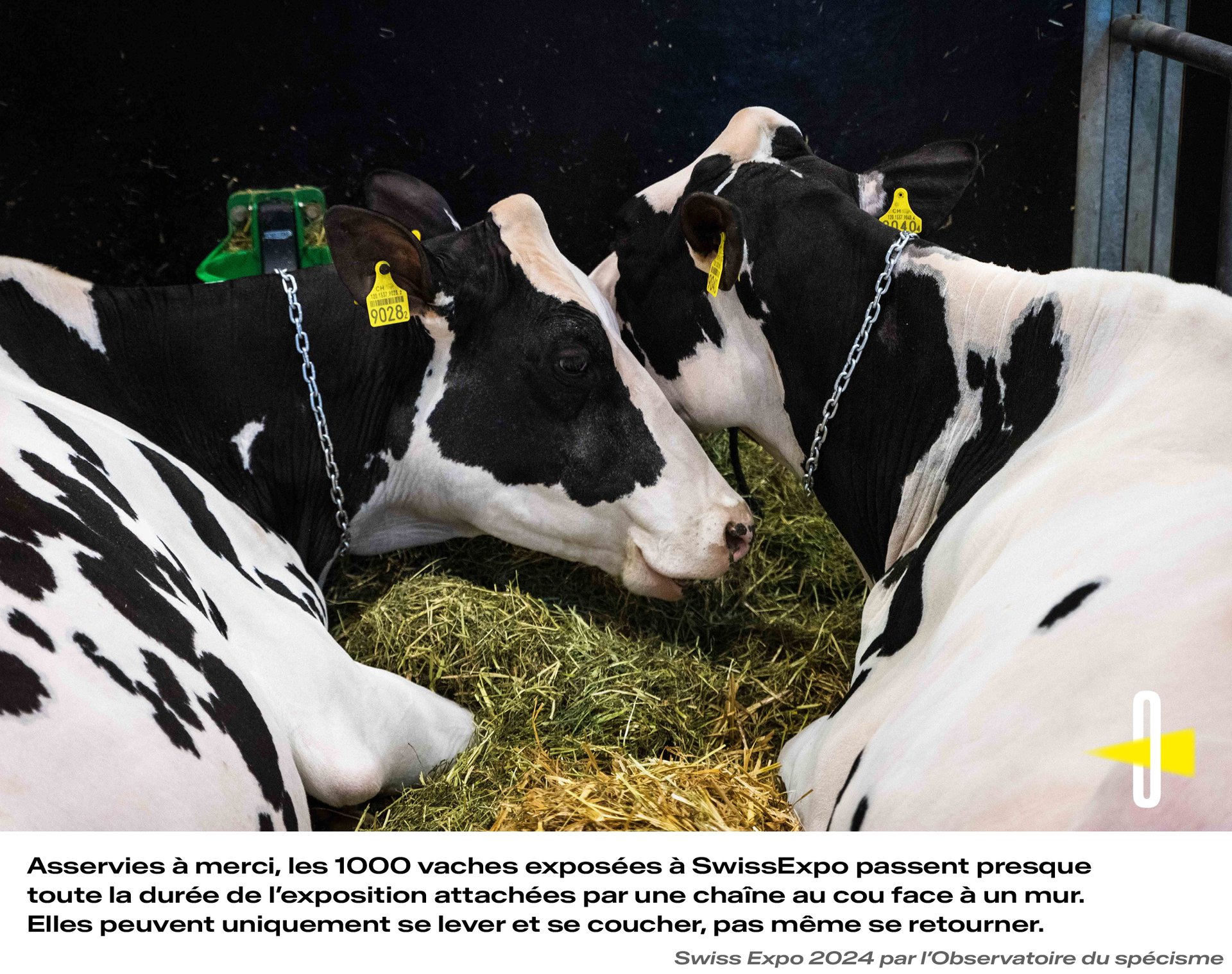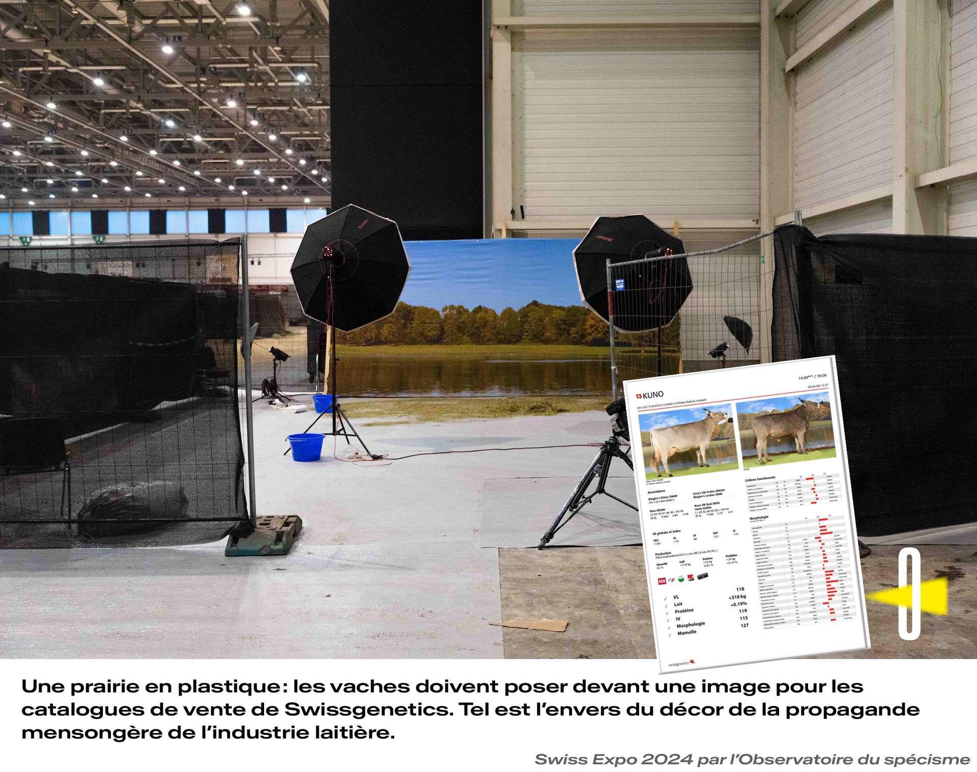 Swiss Expo, qui se définit comme «le concours laitier n°1 en Europe», exhibe chaque année près de 1000 vaches dans de grandes halles où elles subissent la musique constante, le brouhaha, les néons et la foule. Elles sont forcées de parader sur un ring où elles sont réduites à des objets de compétition, à des propriétés évaluées pour leur productivité et leur correspondance à des normes esthétiques arbitraires, purs résultats de manipulations génétiques. Les lauréates de ces expositions sont condamnées à une vie de servitude, destinées à être exploitées jusqu'à ce que leur dernier souffle serve l'industrie laitière insatiable. Si elles vivent en moyenne quelques années de plus que les autres vaches, c’est dans le but d’être inséminées plus longtemps pour donner naissance à des veaux dont les propriétaires pourront vanter la génétique.