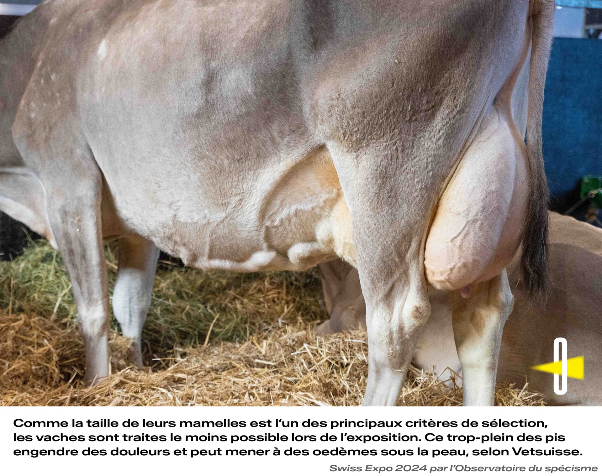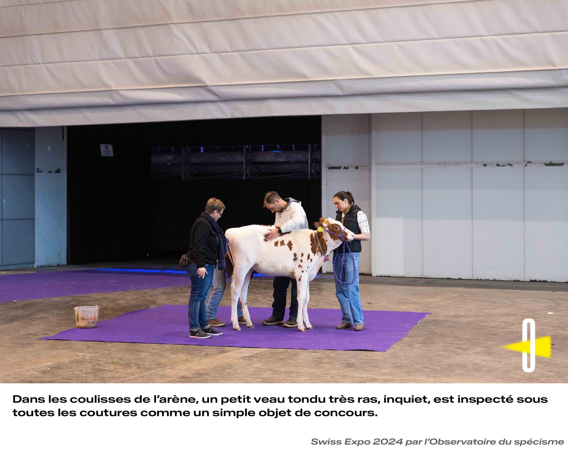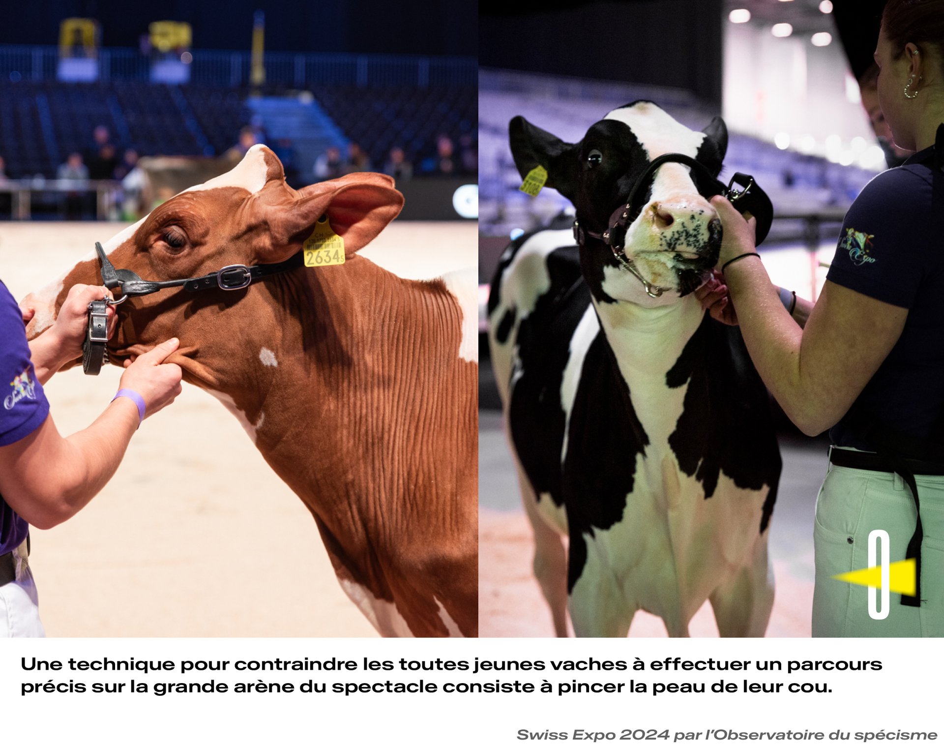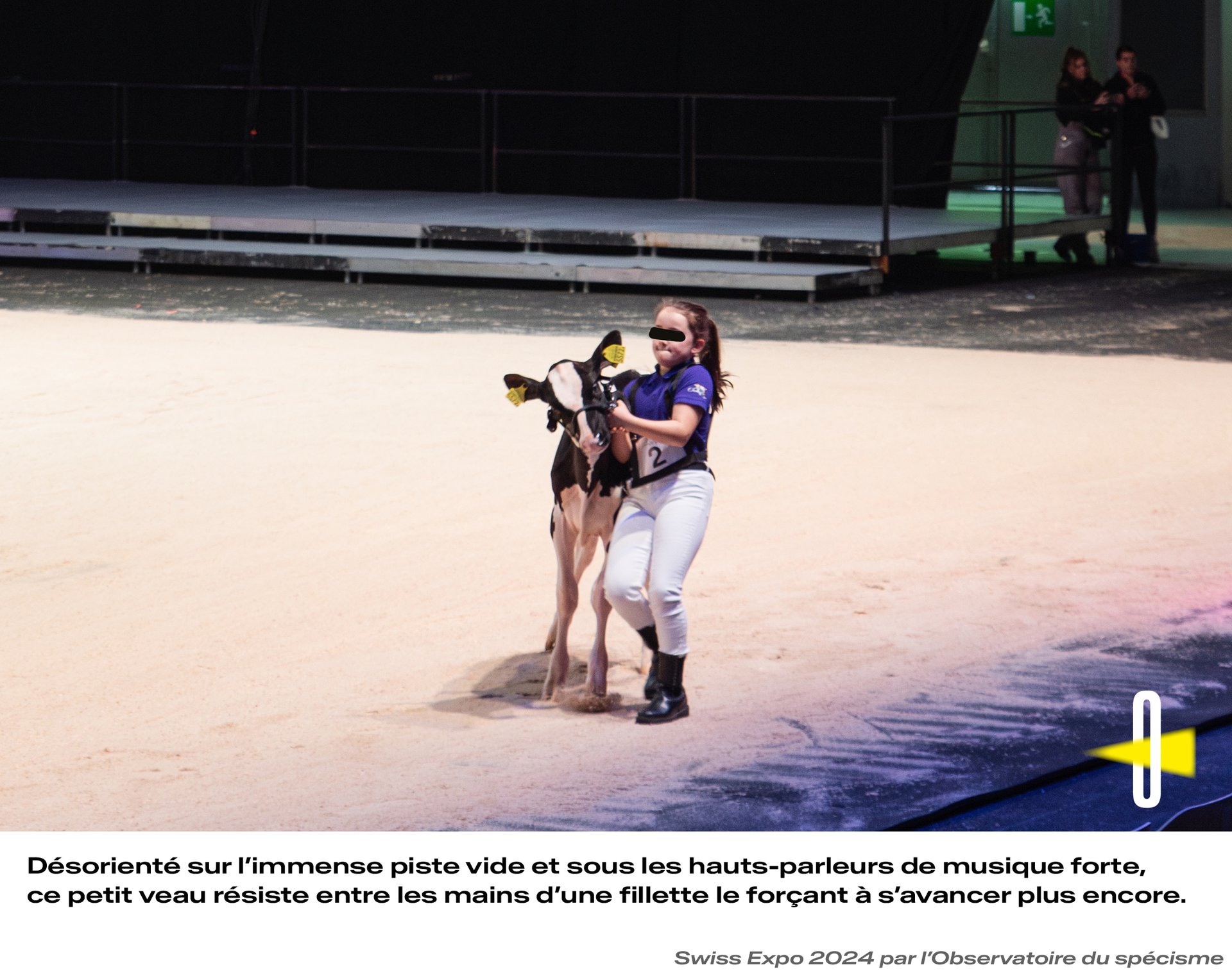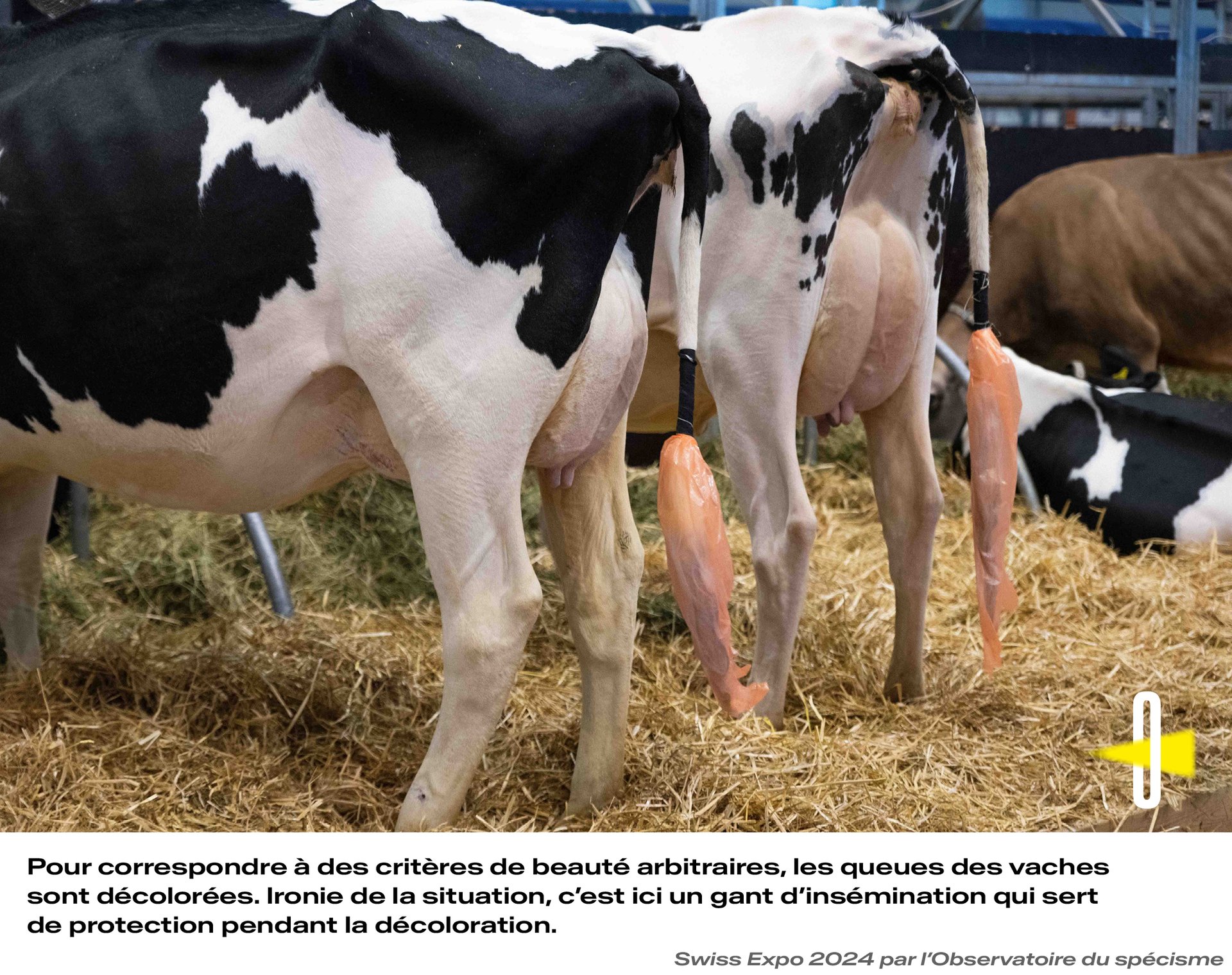Swiss Expo, qui se définit comme «le concours laitier n°1 en Europe», exhibe chaque année près de 1000 vaches dans de grandes halles où elles subissent la musique constante, le brouhaha, les néons et la foule. Elles sont forcées de parader sur un ring où elles sont réduites à des objets de compétition, à des propriétés évaluées pour leur productivité et leur correspondance à des normes esthétiques arbitraires, purs résultats de manipulations génétiques. Les lauréates de ces expositions sont condamnées à une vie de servitude, destinées à être exploitées jusqu'à ce que leur dernier souffle serve l'industrie laitière insatiable. Si elles vivent en moyenne quelques années de plus que les autres vaches, c’est dans le but d’être inséminées plus longtemps pour donner naissance à des veaux dont les propriétaires pourront vanter la génétique.