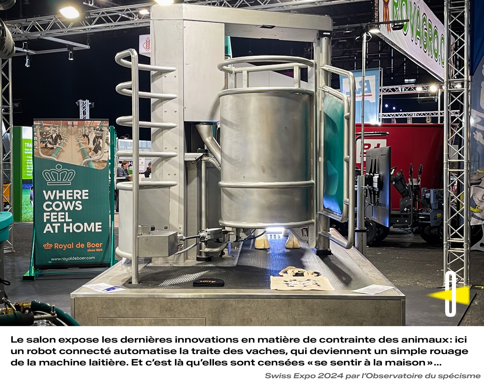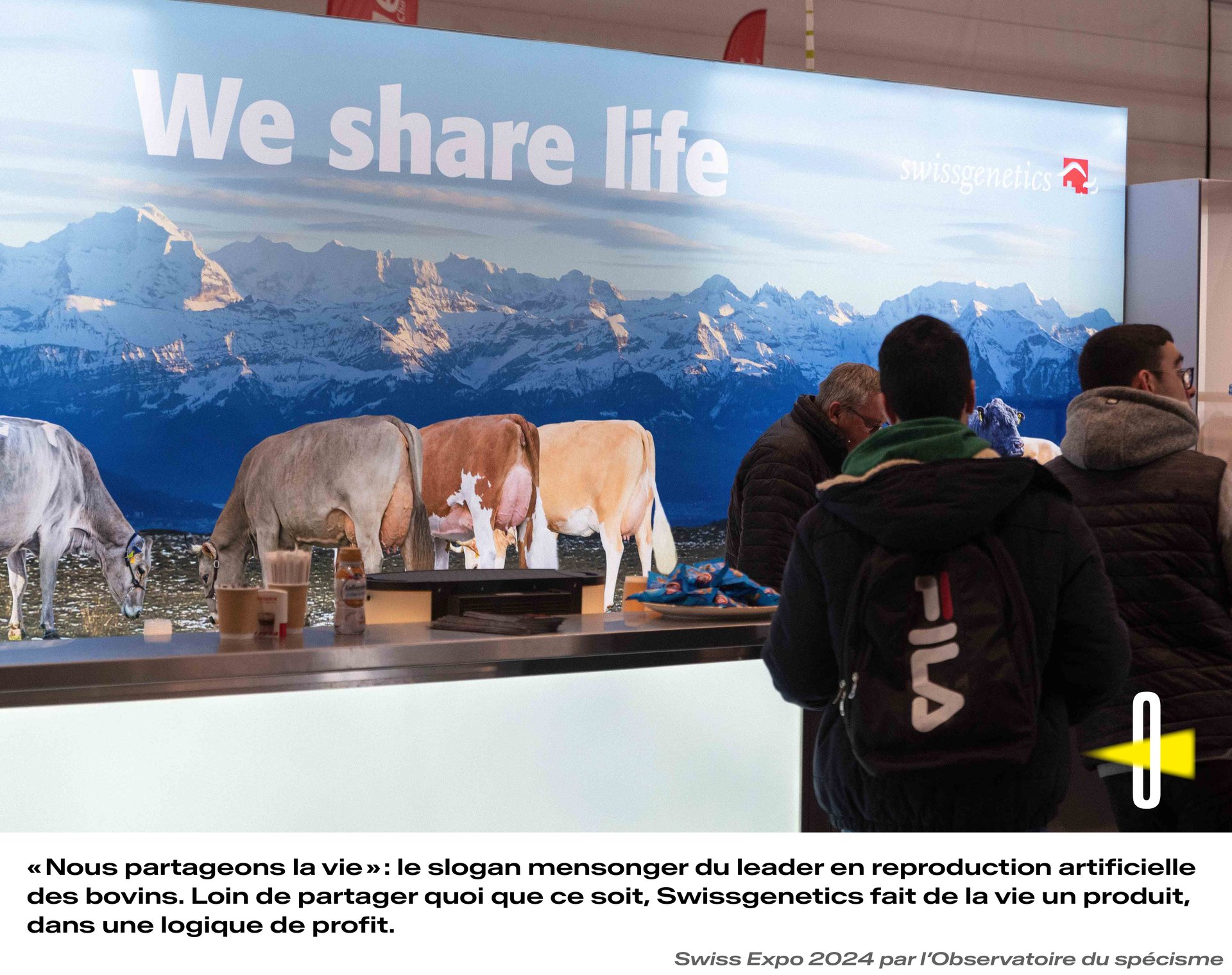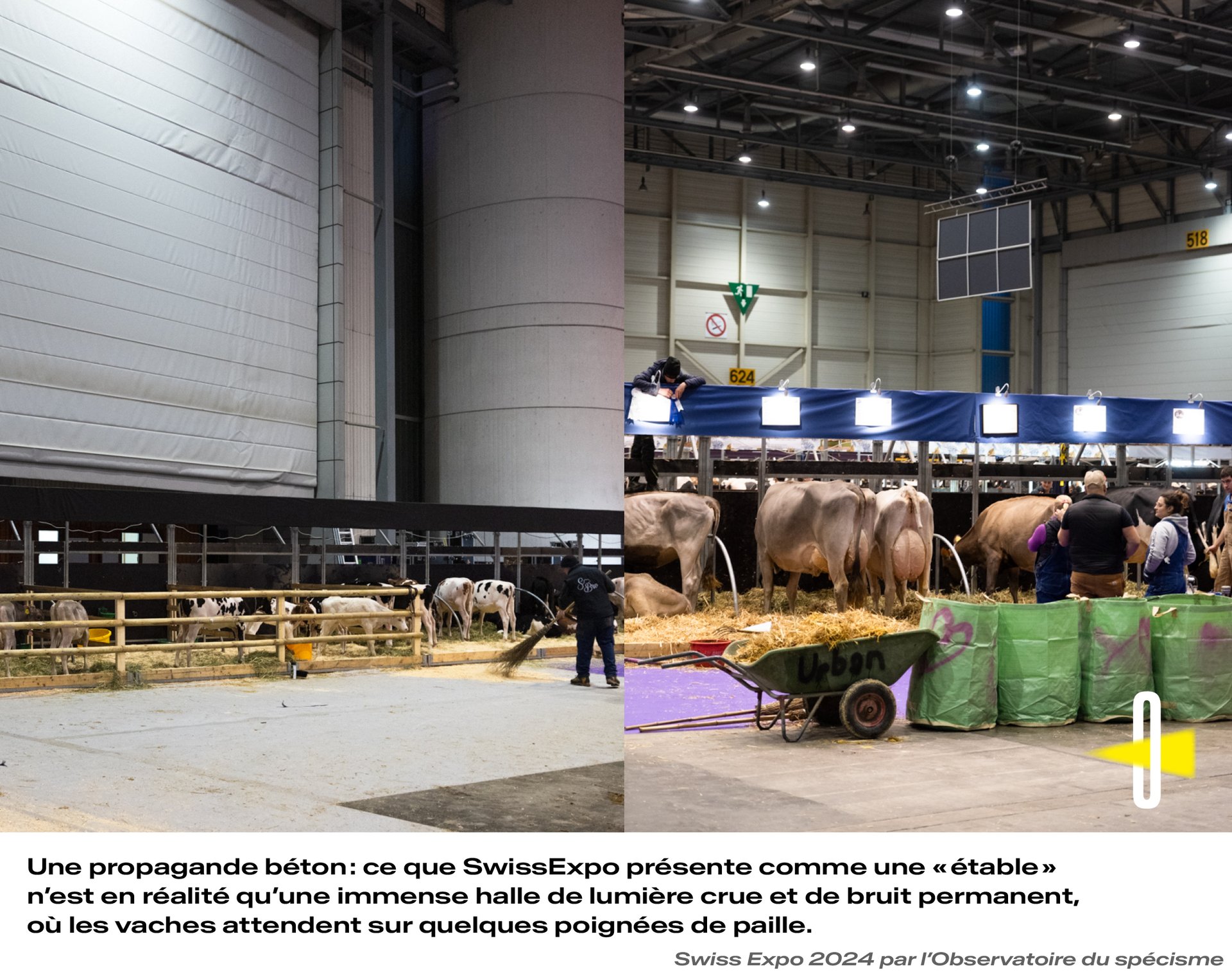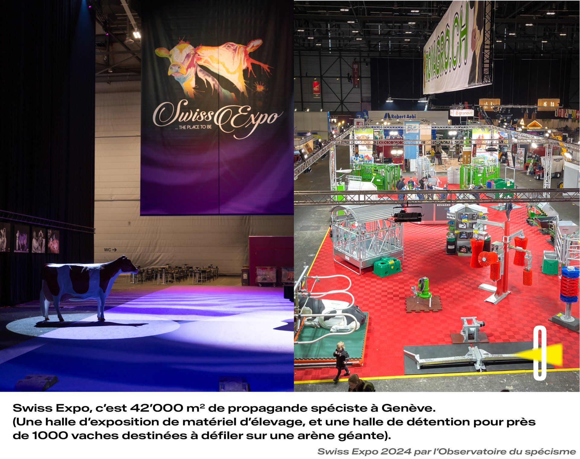 En somme, Swiss Expo est un événement entièrement dédié à la propagande spéciste, le spectacle décomplexé d’une industrie qui ne reconnaît que la valeur utilitaire de l’existence de ces vaches. Nous l’avons visité pour offrir un autre regard sur la réalité de ce salon, et en proposons ici une visite guidée.
