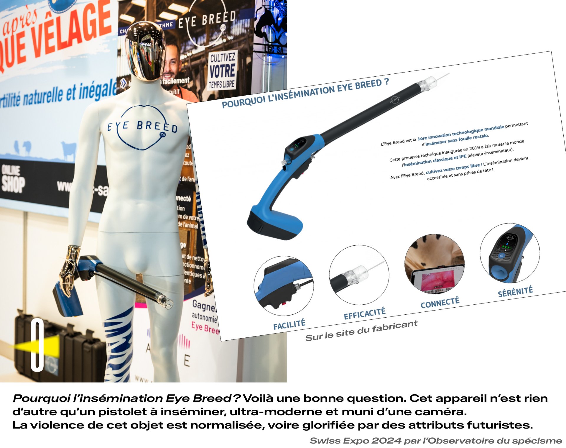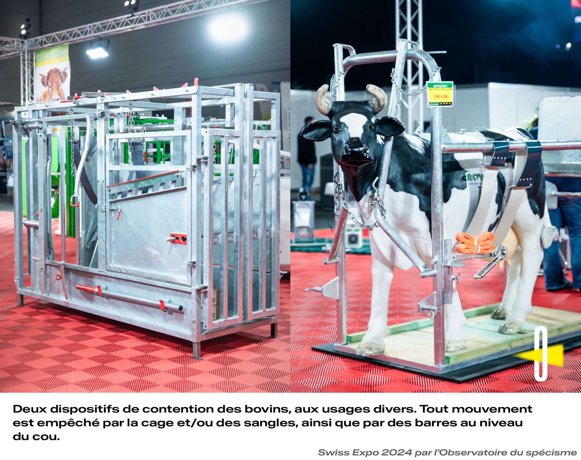 C’est aussi un salon agro-technique, qui expose des cages de contention, des pistolets d’insémination, des boxes à veaux, et les dernières innovations qui servent à la contrainte, à l’enfermement et à l'assujettissement des animaux, comme s’il s’agissait d’objets anodins.